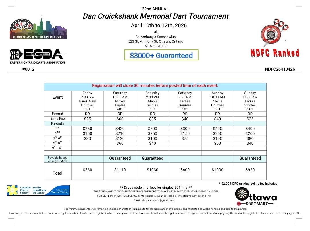 - Last Chance Dart Tournament – NDFC ranked – TBD